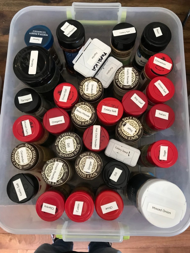 Spice Storage: I didn’t want to take up valuable drawer space for my spices for a couple of years ago I came across these containers from Sterlite that were just perfect. I have two rectangular ones for bottled spices and one squarish one for spice packets. I used a label printer to label the top of the tall bottles and for the smaller ones, they just lay on their sides. The spice packets fit nicely in the square container and I can easily flip through them to find the one I need.